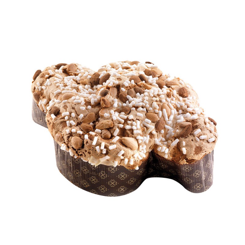 Glassa: zucchero, albume d’uova, mandorle italiane (2,00%), granella di nocciole, farina di grano tenero tipo 00, olio di girasole, farina di mais, amido di mais e granella di zucchero.