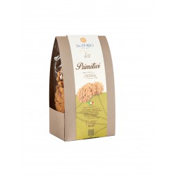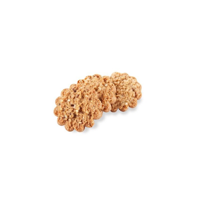 INGREDIENTI: FARINA “00â€, zucchero di canna grezzo, BURRO, NOCCIOLE (14,18 %), ALBUME D’UOVA, zucchero bianco, FARINA integrale multicereali (FARINA di frumento tenero tipo “00â€, di farro integrale, cruschello di frumento tenero, farina di segale integrale, di soia, fumetto di mais, farina di avena, semola di soia integrale, farina di germe di frumento, di orzo, di frumento maltato) (7,09%), FARINA di germe di grano (1,06 %), sale.