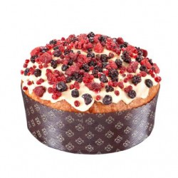 Panettone Sottobosco, senza uvetta, arancio e cedro candito. Farcito con frutti di bosco e crema profumata alla vaniglia e rosmarino.