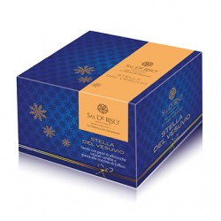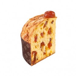 Panettone Stella del Vesuvio, senza uvetta, arancio e cedro candito. Farcito con pezzi di albicocche naturali candite, gocce di cioccolato bianco alle mandorle e glassa alle nocciole.